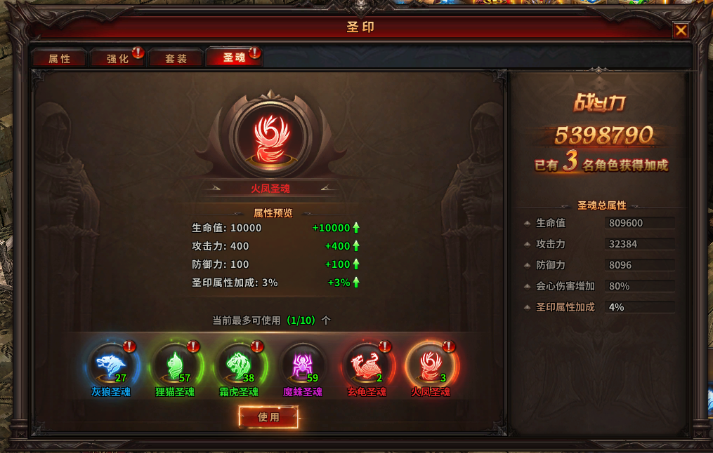 3) 圣魂界面中,可使用圣魂道具提升对应圣魂,获得海量属性加成,还有圣印属性加成等特殊属性;