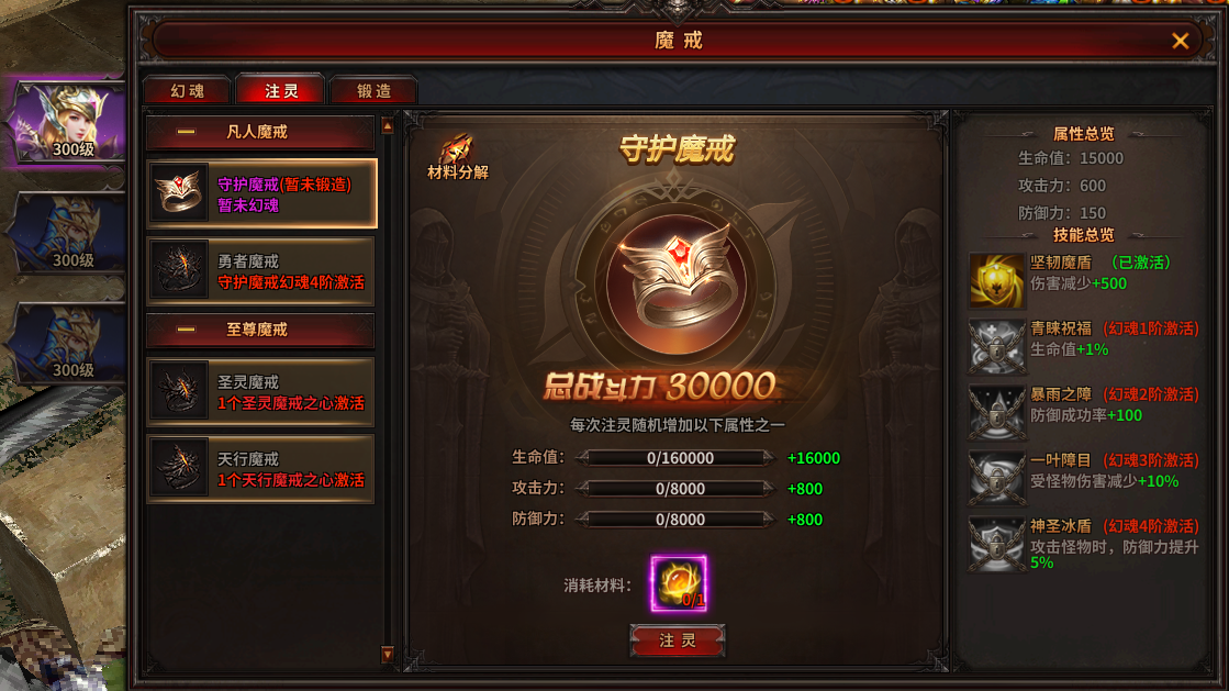 2) 每次注灵将随机提升生命值、攻击力、防御力三种属性中的一种,每次注灵至少增加16000战力。提升魔戒幻魂阶级时可以提升魔戒注灵上限;