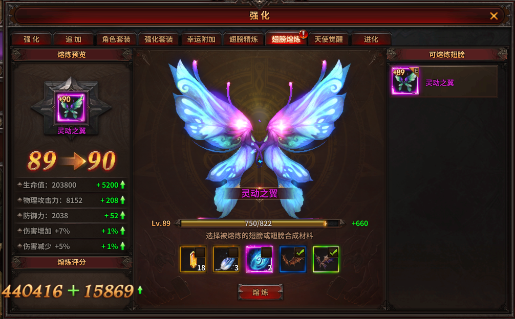 1) 可使用多余的翅膀或翅膀的合成主要材料(玛雅宝石、洛克之羽、神鹰火种、加鲁达火种)进行翅膀熔炼增加熔炼值,来提升熔炼等级并获得属性加成;