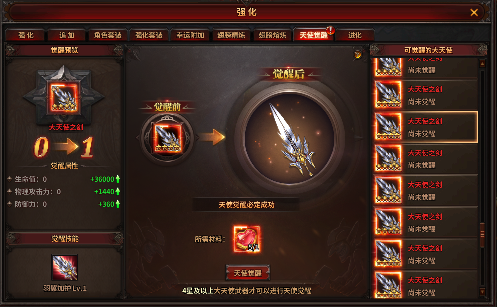 1) 在天使觉醒中,通过消耗大天使之心可以提升大天使武器觉醒等级。觉醒后的大天使武器将会获得强力觉醒属性,更有绝版觉醒技能加持;