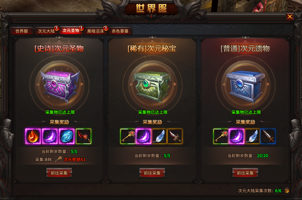 3) 玩家每天有6次采集次数,次数将在每日0时刷新;