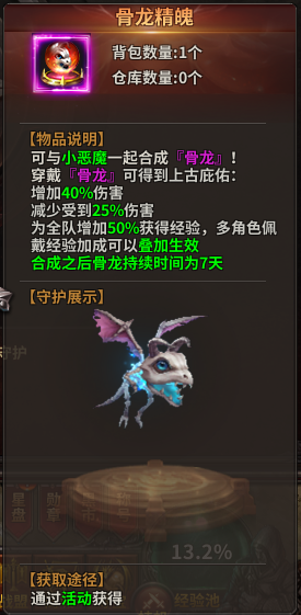 2) 无论原来的小恶魔守护时间剩余多少,合成的骨龙守护剩余时间都将重置为7天。请注意,已经过期的守护无法为骨龙精魄注入灵魂,不能进行合成。