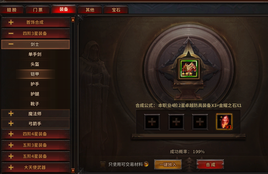 本职业四阶2星装备×3+金耀之石×1可以合成四阶3星装备