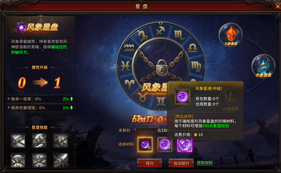 星盘包含水象星盘、火象星盘、土象星盘和风象星盘四张,分别可以提升人物四大方面能力。