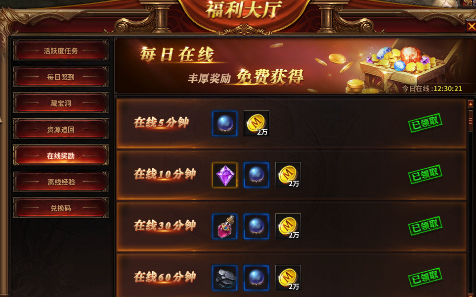 每日在线奖励更有六档,分别如下