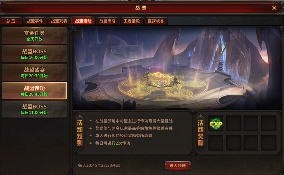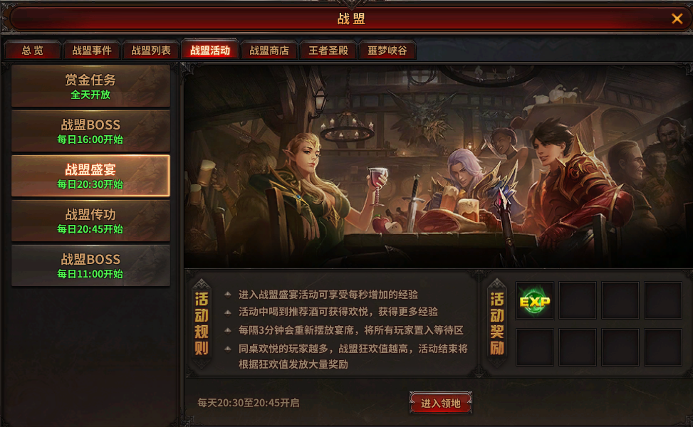 玩家加入战盟之后,每日可以参加一次战盟盛宴和一次战盟传功。战盟盛宴在每天晚上的20:30开始,持续15分钟。