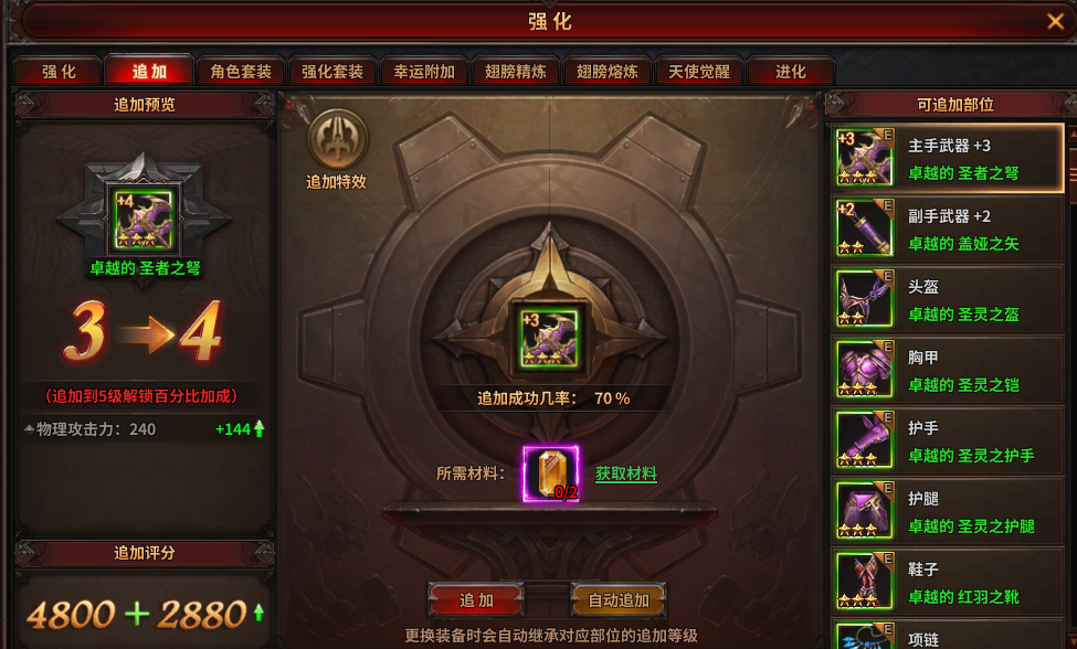 值得一提的是,追加等级对应的是部位,我们在更换新装备时,新装备将会自动继承之前此部位装备的追加等级。也就是说追加等级是一劳永逸的,性价比很高。