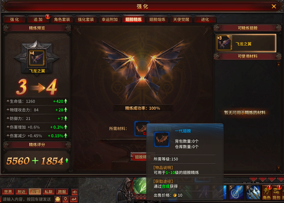 翅膀精炼在强化类别里可以找到,选择翅膀精炼就可以看到,精炼成功率是100%不会失败。