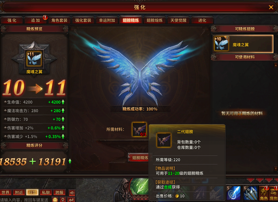 可以看到精炼难度随着精炼等级提升变得越来越难,前10级还好,只需要一代翅膀,10级之后的二代翅膀开始就有难度了,洛克之羽并不是很容易获得。至于三代翅膀的精炼,难得更是可想而知,当然,属性也是非常牛逼。