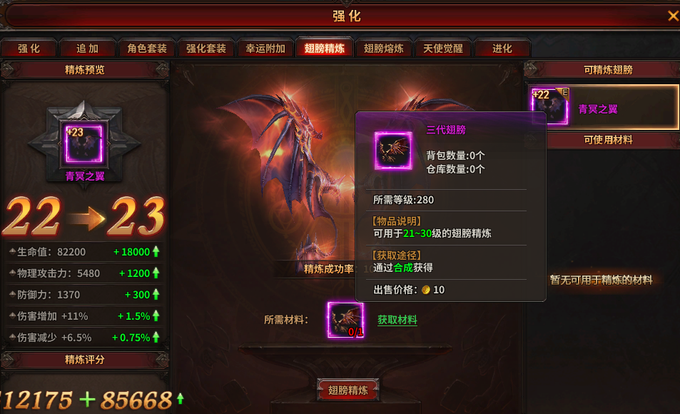 精炼等级1-10级需要一代翅膀1个,提升生命、防御、攻击力三项基本属性和伤害增加、伤害减少两项百分比属性
