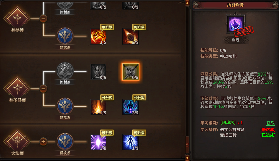 幽魂——被动技能,生命值低于50%自动控制周围3个目标,升级后附加降低目标百分比攻击力DEBUFF