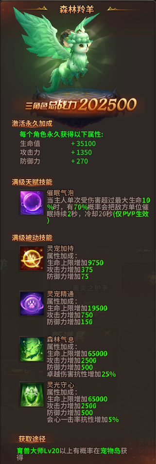 森林羚羊天赋技能——催眠气泡:当主人单词受伤害超过最大生命10%时,有70%概率会把地方单位催眠持续2秒,冷却时间20秒(仅PVP生效)