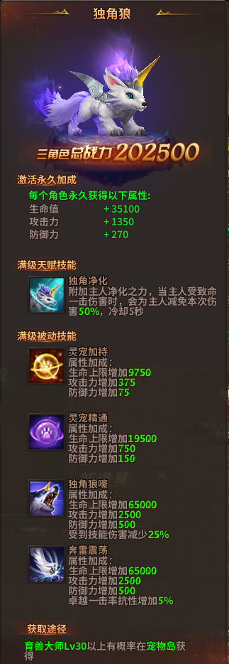 独角狼天赋技能——独角进化:附加主人进化之力,当主人受致命一击伤害时,会为主人减免本次伤害50%,冷却5秒