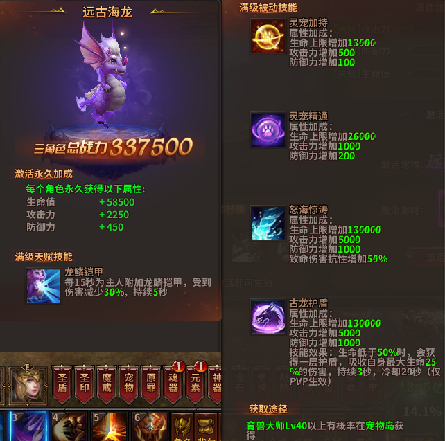 远古海龙天赋技能——龙鳞铠甲:每15秒为主人附加龙鳞铠甲,受到伤害减少30%,持续5秒