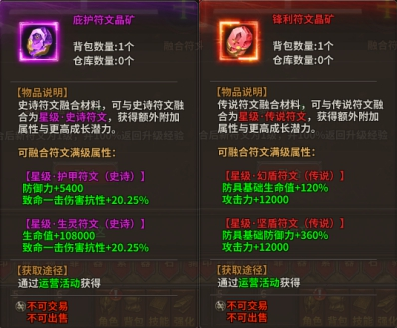 以上就是符文晶矿玩法和详细规则,可以发现这次的晶矿玩法并不像之前有些玩家考虑的需要提前预存多余的符文,也不需要额外多存经验,只要得到晶矿就可以直接合成新的星级符文,不需要其他额外材料,原先符文的经验也会全部返还,可以直接用来升级新的星级符文,战力当场就能得到飙升。这里值得一提的是,由于红色传说符文获取难度较大,大家不妨优先合成紫色星级符文,两条属性的紫色星级符文,在属性和战力上已经无限接近红色传说符文,待到获得红色传说符文和晶矿后再考虑替换,完全不耽误练级和打怪,星级符文在额外属性的加持下在PVP时候的表现甚至要高于红色传说符文。
