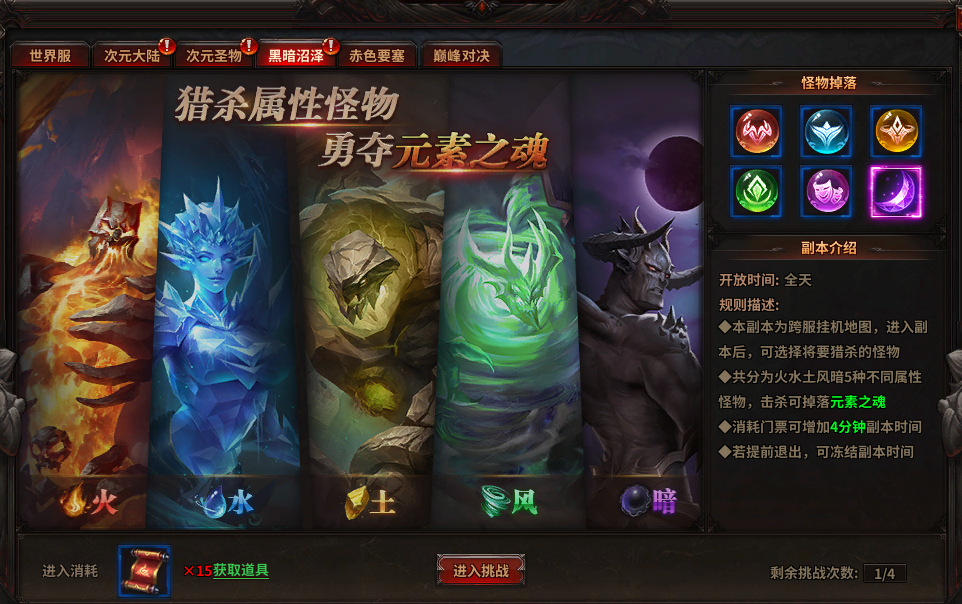 它们被盘踞大陆的BOSS所收藏,玩家可以通过击杀次元大陆的BOSS归属奖励获得;同时根据装备品质,每件元素装备拥有一定数量的潜能效果,需要达成条件才可激活。