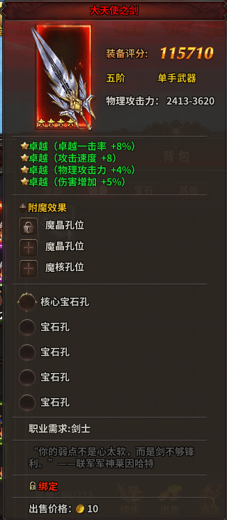 通过上图我们可以看到,最为终极武器的大天使之剑本身就拥有远超同阶装备的属性,在通过消耗大天使之心觉醒后会获得大量生命、攻击力、防御力的加成。