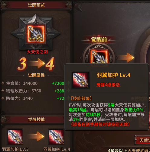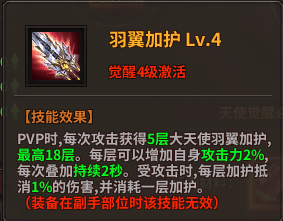 与此同时,大天使武器觉醒之后还会给角色提供一个名为羽翼加护的觉醒技能:PVP时,每次攻击获得X层大天使羽翼加护,最高X层。每层可以增加自身攻击力2%,每次叠加持续2秒。受到攻击时,每层加护底抵消1%的伤害,并消耗一层加护。