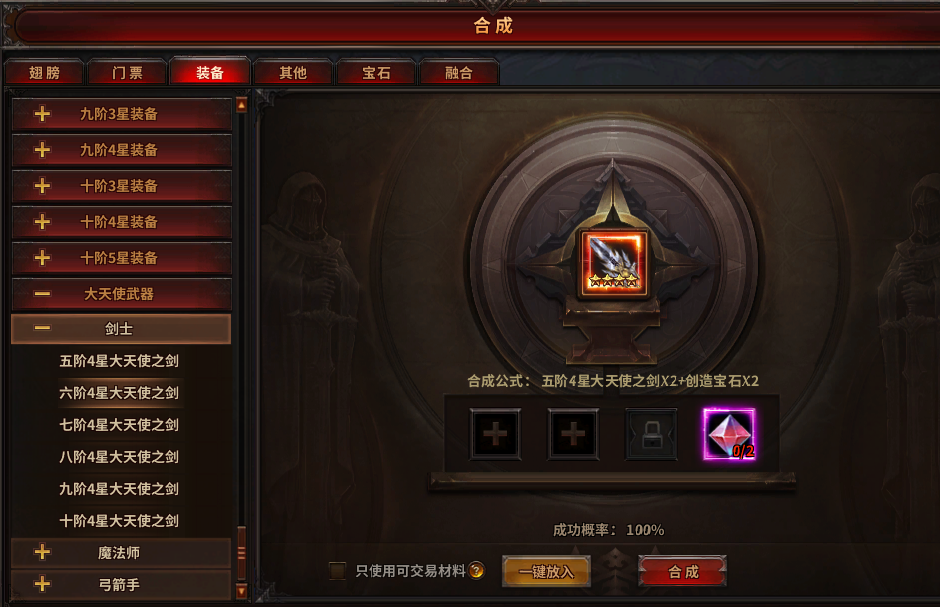 五阶3星大天使之剑×2+创造宝石×1可以合成五阶4星大天使之剑