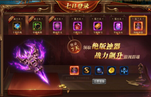 第7天登录:免费领取绝版神器“凋零之锥”,坚韧意志称号,初级坐骑丹X5,10万金币,刀锋意志称号