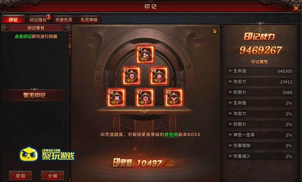 1) 印记为三角色共用,每个孔可佩戴对应类型的印记。佩戴印记后,可获得属性和印灵值。印记阶数、品质越高,则印灵值越高、属性越强;