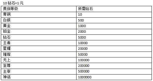 特玩网页游戏vip(贵族)等级表,以下是各个等级vip价格,每阶需要充值多少RMB。