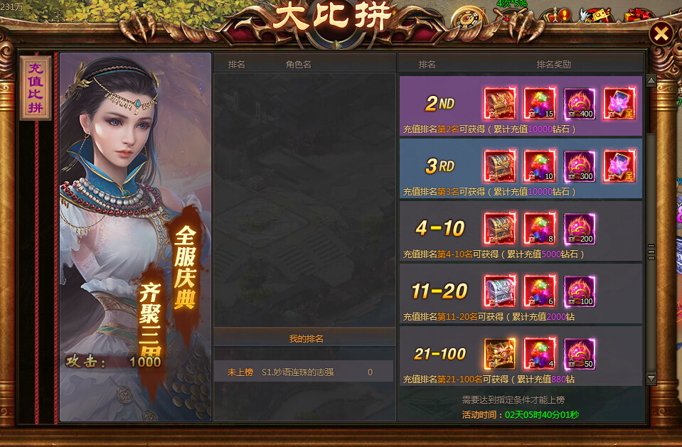 玩家累计充值达到指定金额即可参与对应的排名奖励。部分奖励只有一个,玩家之间需要进行竞争,才可以拿到,差了一个名次奖励就是千差万别。充值砖石只需要玩家在活动期间累计充值达到即可,不需要一次性充满。