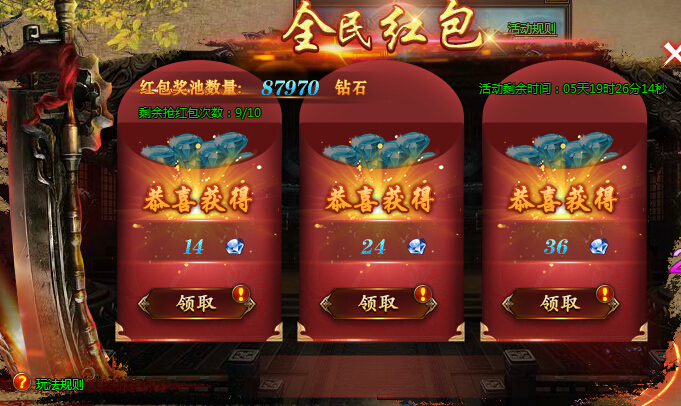 特玩网页游戏烽火九州中新服开启后,玩家达到一定等级即可开启全民红包活动,玩家每日可以免费抽取10次红包,每个红包中都有大量的钻石奖励。