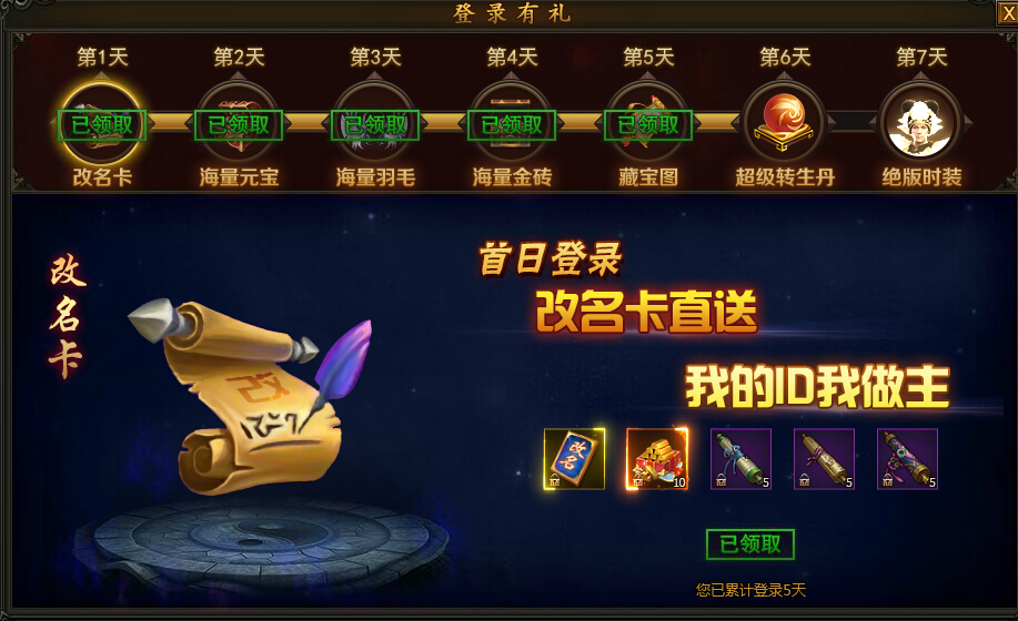 第一天:改名卡、金砖箱*10、宁古塔入场券*5、诏狱入场券*5、boss挑战券*5
