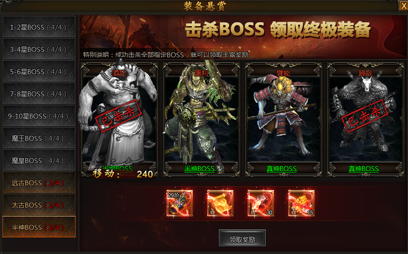 装备悬赏特别说明:每个档次的奖励都需要击杀4个不同的boss,例如半神奖励:玩家需要击杀半神boss酒狂、半神boss屠利、真神boss臂能、真神boss蹄战,boss击杀完成后即可领取:29阶装备右腕、藏宝图·魔、洗练石*30、金砖箱*30。