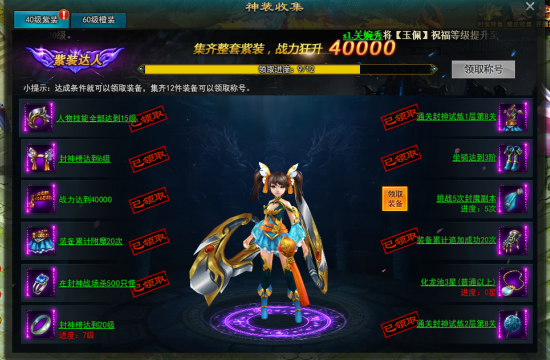2.当达到所有紫色装备的要求时,就可以领取“紫装达人”的称号。