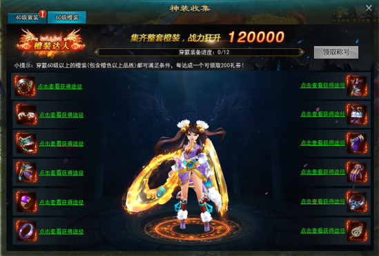 3.当12件全部穿戴后,还可以领取“橙装达人”称号。