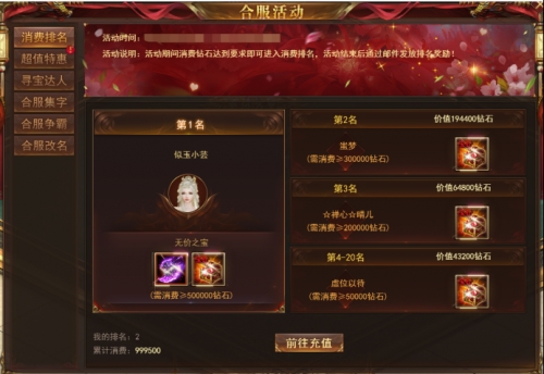 活动期间消费钻石达到相应条件即可进入消费排名,排名越前奖励越丰厚,只有前20名的玩家才有排名奖励,活动结束后通过邮件发放排名奖励!