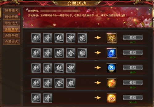 活动期间击杀boss掉落活动字,收集后可兑换丰厚大礼,每天24点更新兑换次数!