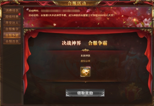 合服第3天开启神界争霸,成为神族的仙盟盟主可领取20000钻石大奖!