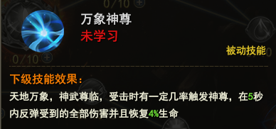 万象神尊是唯一一个反弹伤害的技能,而且是反弹全部伤害并且恢复自身生命。这个技能其实是专门为以弱胜强打造的。在战斗力与对方差距较大时,技能触发后可以扭转败局。从灵御出发到万象神尊一路上各种属性都有加到,包括星术、武力、护甲、生命等等,最终达到万象神尊技能。走这条线可以给玩家带来一个比较平衡的属性提升,提高生存几率。从武力出发,到达万象神尊一路上则注重对目标的伤害,包括穿甲、命中、体力、攻击、武力和最大生命值提升恢复生命值技能,可以说是为PVP专门打造的一条线路,不过也是消耗天赋点最多的一条线。价值很高,但是代价也很大。