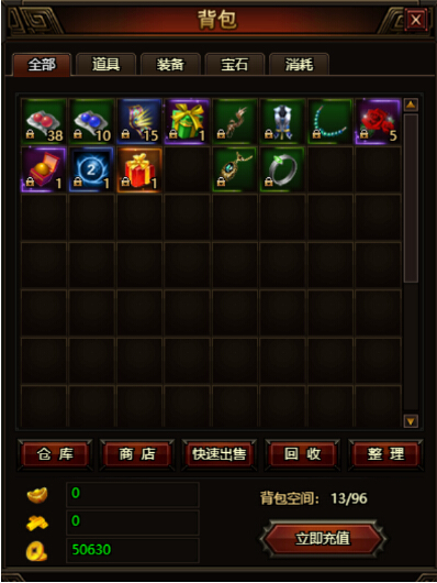 背包用于存放所有的道具装备。玩家进入游戏时默认开启背包系统。背包系统中共有96个物品栏,最多可存放96种道具装备。若是装备数量或种类超出物品栏数目,可以将多余物品转入仓库存放。