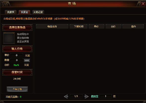 出售商品在“我要卖”栏目中进行操作。打开“我要卖”栏目时,玩家的背包会同时开启。玩家可以选中背包里想要卖掉的东西,然后点击“快速出售”按钮就可以把商品挂到市场里。在挂出商品时,玩家可以自己设定出售价格和出售数量。市场中出售的商品最多只能保留24个小时,如果24小时之后商品还未卖出去,那么该商品就会自动退回到背包里。