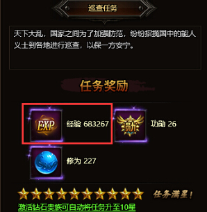 巡查任务是一类日常任务,可在NPC巡查官处接取。巡查任务有大量经验奖励,任务星级越高,奖励的经验越多。玩家可以在接取任务时刷新任务星级来增加奖励,最高可刷至10星级。激活钻石贵族特权后,巡查任务星级会自动升至10星。