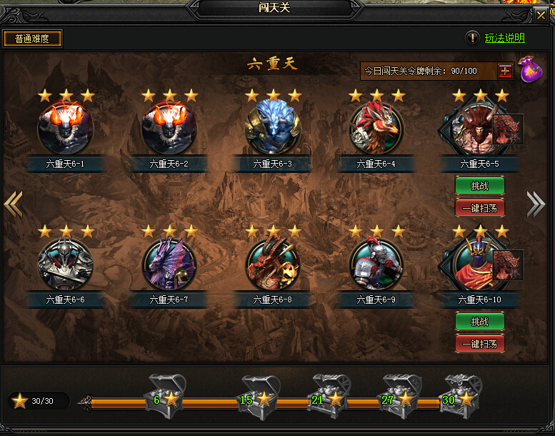 1.每个关卡都拥有一次免费挑战机会,之后再次挑战需要消耗天关令牌。