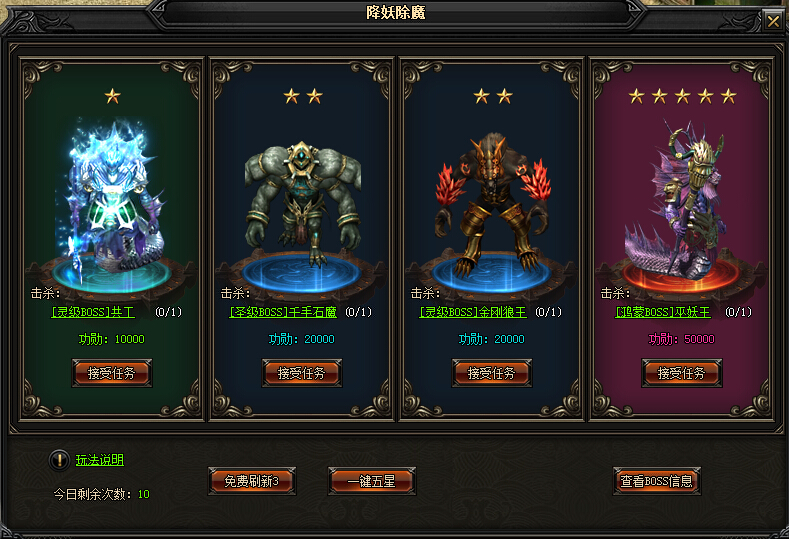 大佬玩家的话建议全部完成5星任务,其他一般玩家的话建议完成3星以上的任务。3星任务一般通过免费刷新任务基本上可以完成10次的降妖除魔任务了。