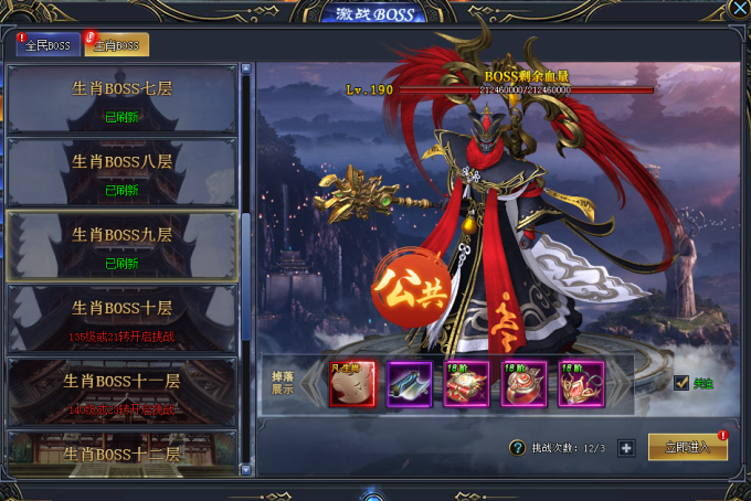 当福利BOSS已经不能满足我们的战力时,可以来试试挑战生肖BOSS,这里的BOSS更为强大!既然是挑战就不可避免有竞争者,展现你真正的实力,击败那些抢你机缘的竞争者独霸BOSS奖励!