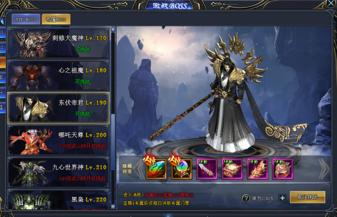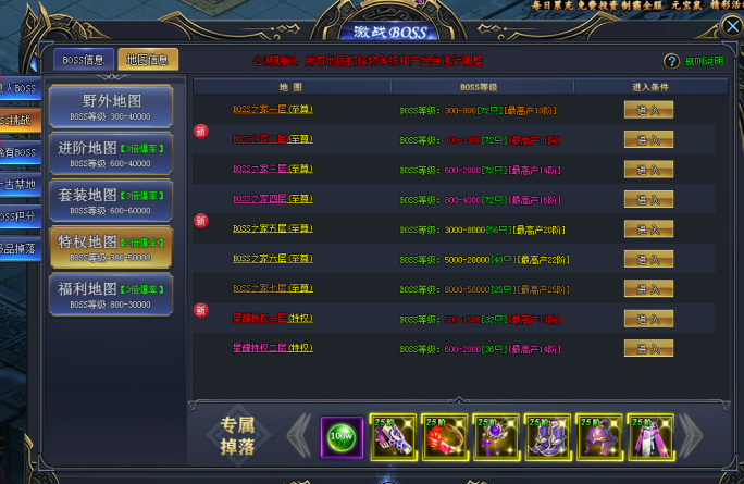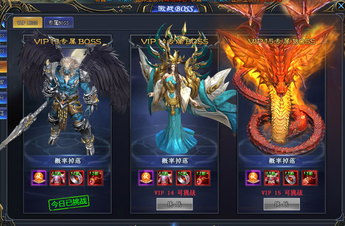 只有VIP用户才能挑战的BOSS!VIP BOSS为个人副本,安全打BOSS,从容捡装备!VIP等级越高,可以挑战的BOSS也就越强,掉落的装备也就越极品,各位一定要抓紧机会,激活VIP,挑战属于自己的BOSS,掉落更多更极品的神装!