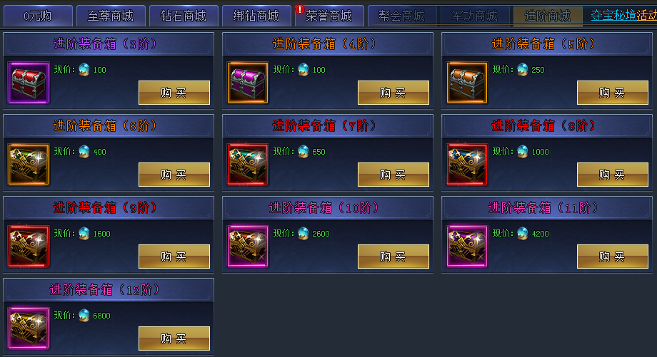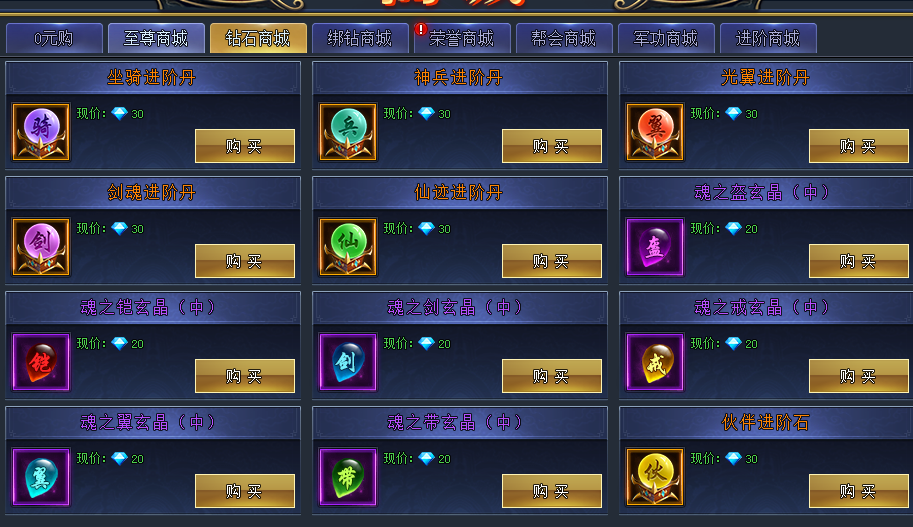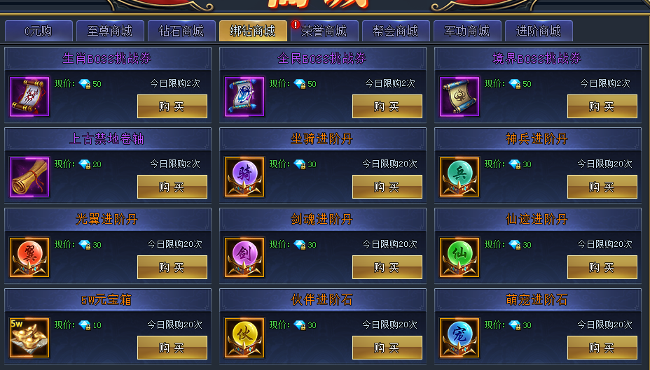 游戏中绑钻还是很好获取的,我们主要消费也在这里,每天的各个BOSS挑战卷是必买的,前期特别是生肖,能在副本打齐一套,可以省去上千钻去开礼包。各种进阶丹每天10个,必须全买,其他道具根据需要来,有需要再买。