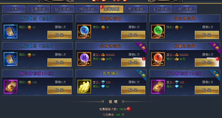 这里消费的是竞技场给的荣誉,这里是技能书页以及秘籍的主要来源,每天有免费的刷新次数,根据自己的需求购买各个级别的书页和秘籍。7日封神活动第5天内容就是技能等级,所以提前购买很有必要,等到第5天时候再购买的话免费的刷新次数一定是不够的!