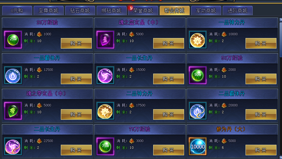 按照帮会等级解锁更多物品,这里我们的需求只有三种丹,可以吃的次数也有限,买够就行了。