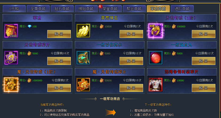 这里的特戒不建议购买,特戒碎片也可以等到可以合成的时候再买不着急,军功是急于提升官职的大佬们可以考虑购买的,如果跨服PK激烈,每天够适当购买减伤药水和强血丸,对PK作用非常大,但仅限于国家战场内使用。