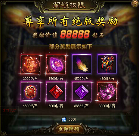礼包分为2个,一个是普通奖励、一个是绝版礼包奖励。玩家欢乐等级提升后即可领取对应的欢乐等级奖励。铍铜奖励中有烟火、龙血晶石、神秘积分、圣妖宝箱等等奖励,玩家也可以花费8888钻石解锁权限,领取价值88888钻石奖励,其中部分奖励有等级碎片、工匠之魂、羽毛、圣妖神石、末日特戒等等。