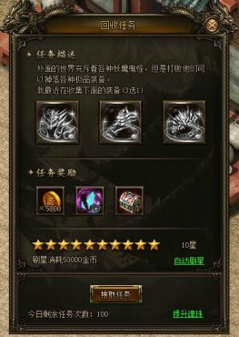 玩家可以在圣妖城(122,82)金不换处接取到回收任务,回收务每天可以完成3次。完成后可以获得大量圣妖币、魂珠碎片和回收宝箱。
