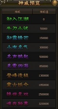 神威名称和相对应的神威值如图所示,神威越高,对于低于自己神威的玩家的攻击额外伤害越高,同时还能增加一定的属性,可谓是一举两得。